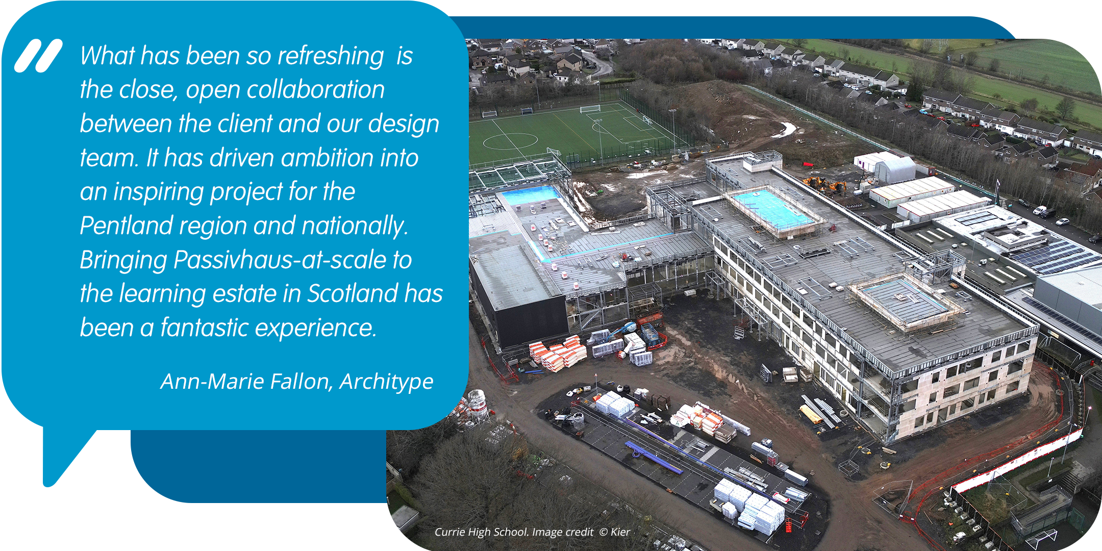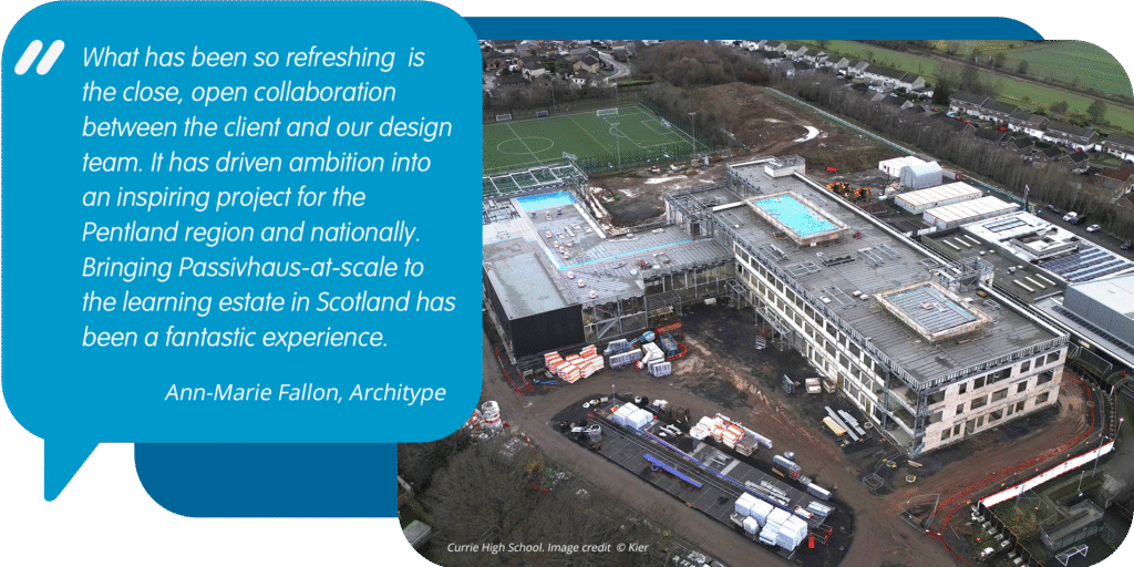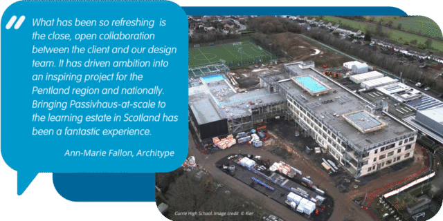 Currie Community High School will be one of the first high schools in Scotland to be built to the Passivhaus standard, reducing the building’s total energy usage up to 70% compared to a traditional build school and making it more cost effective to run.