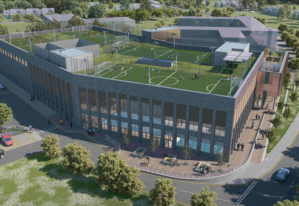 The investment in health, leisure and well-being will see local residents benefit from an eight lane 25m main pool, learner pool, splash pad and spa. Further sports facilities include a 6-court sports hall, three squash courts, 950 square metres of fitness space, two studios, one spin studio and a multi-use room which combines to create two further badminton courts. There ia an open plan café and reception space, along with a roof terrace overlooking four small-sided 3G football pitches.